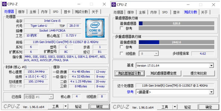 经过CPU-Z基准测试,单核处理器得分528.8,多核处理器得分2442.6。