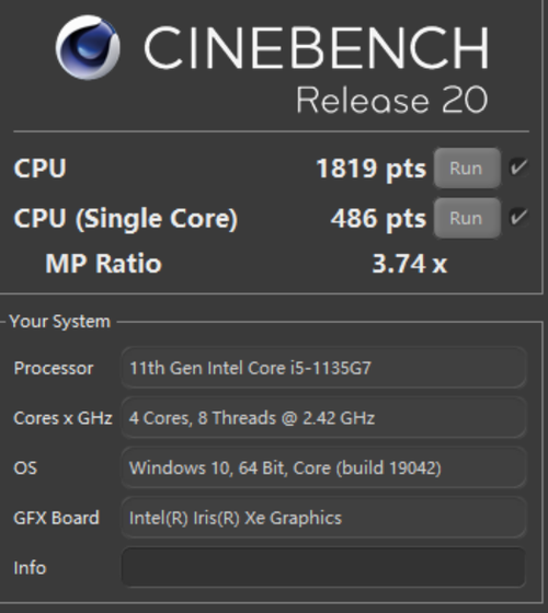 R20主要考验CPU的渲染计算能力,经测试,i5-1135G7在Surface Laptop 4上的多核成绩为1819pts,单核为486pts,也是一个非常不错的成绩,在日常使用中可以帮助用户完成一定的复杂工作。