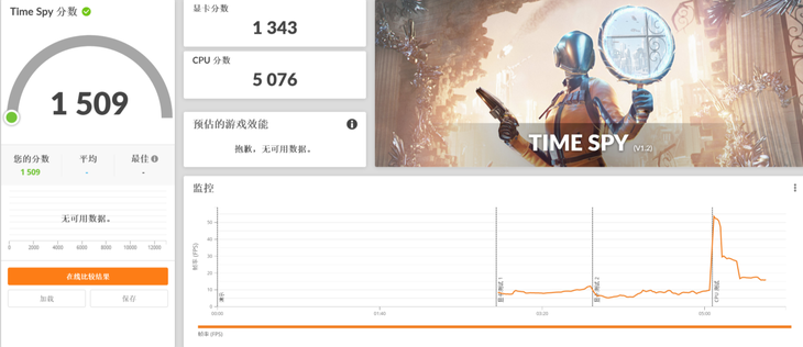 3DMark Time Spy是一个DX12基准测试,可分别测试GPU和CPU对DX12的支持,主要适用于游戏本,结果显示综合分数1509,显卡分数1343,CPU分数5076。