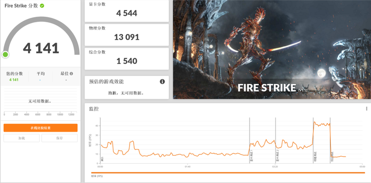 Fire Strike是对GPU性能的综合性测试,使用DirectX 11引擎并且是专门用来测试DirectX 11兼容硬件的。Surface Laptop 4的Fire Strike得分为4141分,显卡得分4544,物理得分13091,综合得分1540。