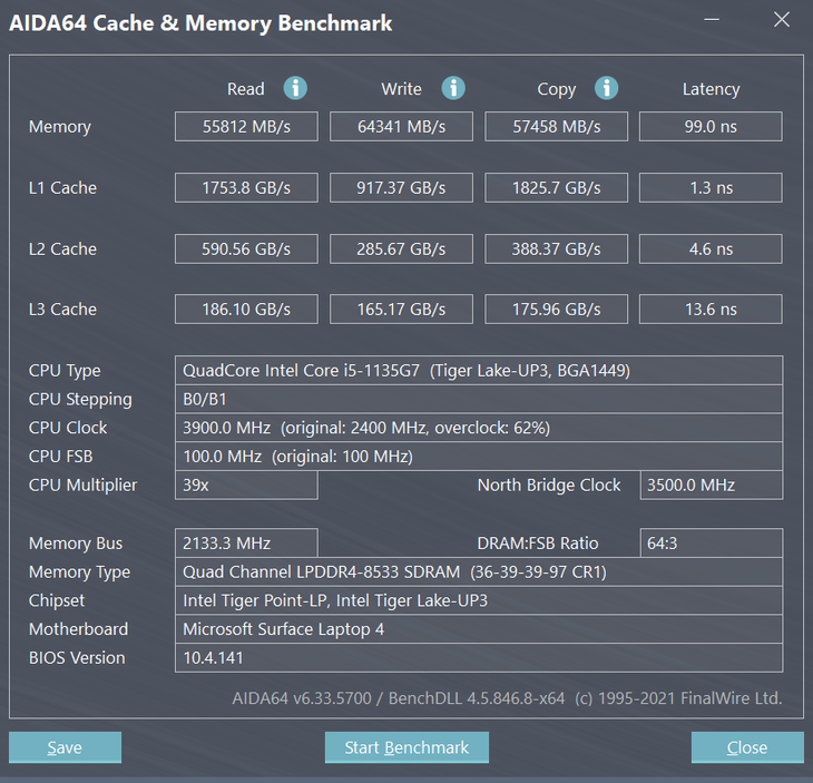 Surface Laptop 4采用了8GB LPDDR4x内存,AIDA64测试显示,读取速度为55812MB/s,写入速度为64341MB/s,复制速度为57458MB/s,时延为99.9ns,表现还是非常不错的,在日常使用中会有优秀的表现。