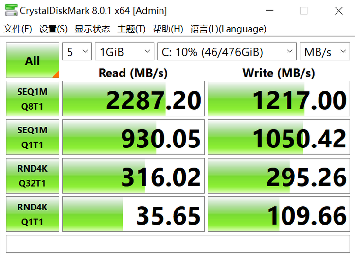 Surface Laptop 4拥有512GB的硬盘,采用的NVMe协议,硬盘顺序读取速度为2287.2MB/s,写入速度为1217MB/s,传输速度非常快,日常使用也很不错。
