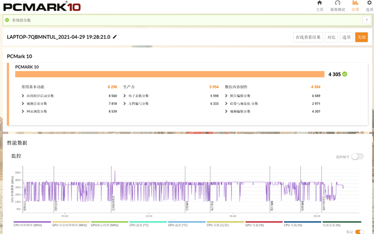 PCMark 10可以测试整机的综合性能,尤其是在模拟现代办公方面,代表在日常办公环境下笔记本的性能表现。经过测试,Surface Laptop 4的综合成绩为4305,对于一款轻薄便携本来说,这样的成绩还是很不错的。