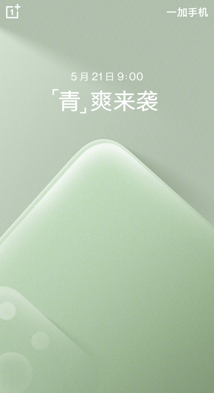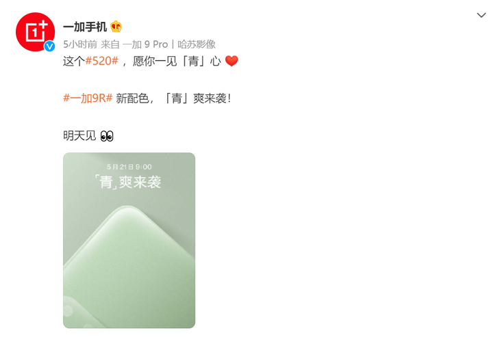 5月20日,一加手机宣布,一加9R新配色「青」爽来袭,明天见。