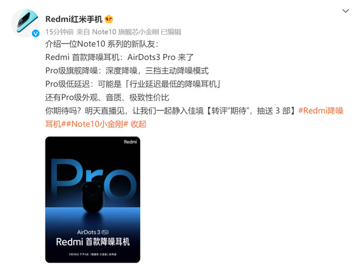 5月25日,Redmi红米手机宣布,Redmi 首款降噪耳机:AirDots3 Pro 来了,将会在明天正式发布。