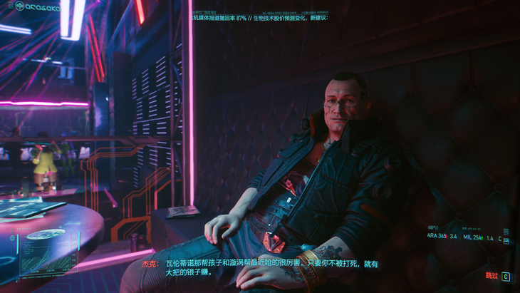 《赛博朋克2077》对人物模型的塑造是比较精细的。例如上面这张面对杰克的场景,人物的衣着装饰很细致。而AGON PRO旗舰产品AG274UXP具备27英寸、4K分辨率,屏幕PPI很高,能够将《赛博朋克2077》这款游戏的画面细节很好地展现出来。
