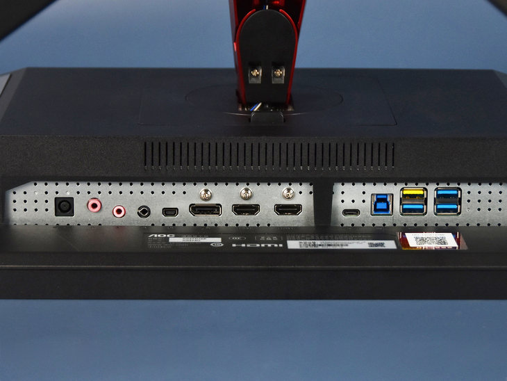接口部分,这款显示器是比较丰富的,提供有电源接口、音效输出接口、麦克风输入接口、麦克风输出接口、桌面人机控制器接口、一个DP 1.4接口、两个HDMI 2.1接口、一个Type-C接口(65W功率输出)、一个USB上行接口、四个USB3.2接口。
