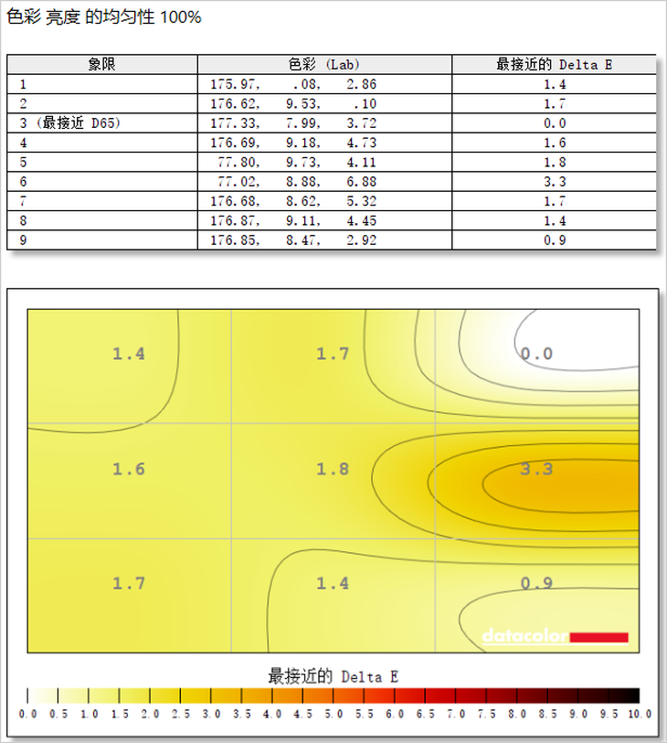 测试小结:在D65标准中,色温值为6500K表示色彩比较准确,不会出现偏冷或者偏暖。通过测试可知,这款显示器右上角区域(3号测试区域)最接近D65的标准。屏幕左侧区域(6号测试区域)偏差最大,差值为3.3。整体上看,这款显示器的色温均匀度控制得不错。