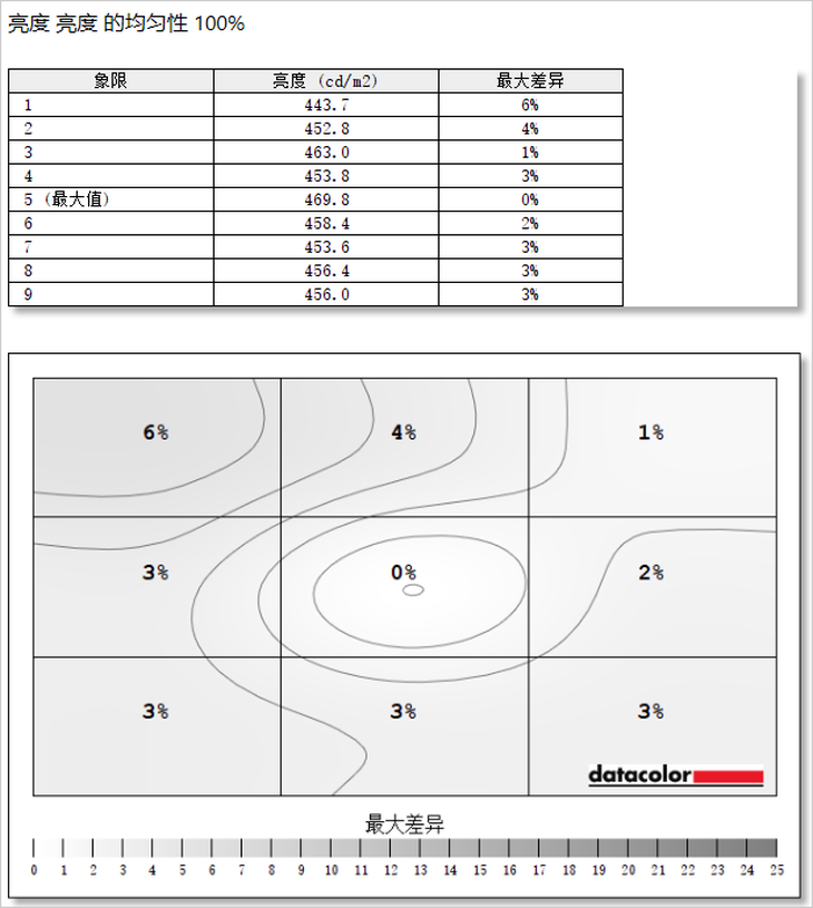 在亮度均匀性方面,这款显示器中央区域(5号测试区域)亮度最高,达到了469.8cd/m2。它的左上角区域(1号测试区域)亮度偏差最大,差值达到了6%。整体上看,这款显示器的亮度均匀度控制得很棒。
