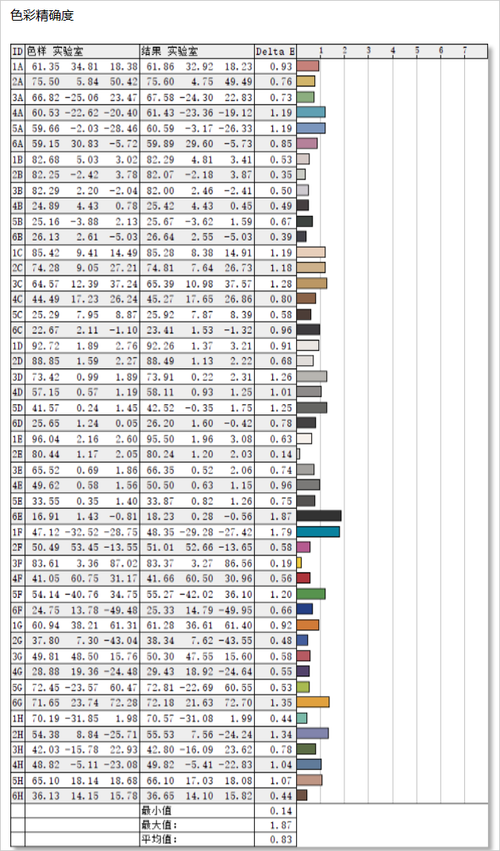 当1<△E<3时,人眼通过比对后能辨别细微的颜色差异;