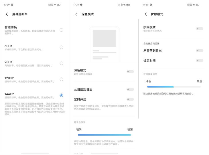 屏幕支持144Hz高刷新率,提供五个档位可供选择,你可以直接开启智能切换模式,系统会根据不同场景切换刷新率,兼顾画面流畅和功耗的平衡。在144Hz刷新率模式下,系统界面等场景滑动都非常流畅。此外,系统还提供护眼模式、深色模式等显示功能。