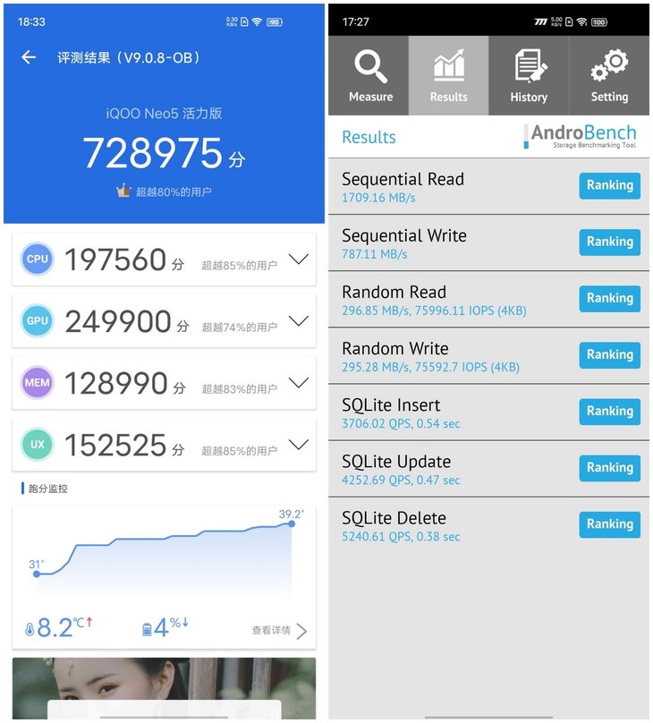 跑分方面,iQOO Neo5 活力版安兔兔最新V9版本跑分可达72万+,增强版UFS 3.1存储读写表现也十分优秀,打开大型游戏、日常应用等都更加迅速,iQOO Neo5 活力版的综合性能属于旗舰级水准。