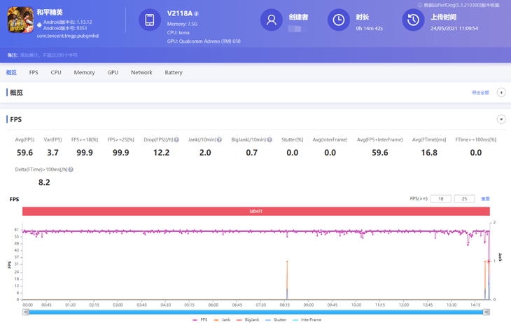 软件记录到的《和平精英》游戏平均帧数为59.6帧,全程只有极小的帧率波动,游戏画面同样很流畅。