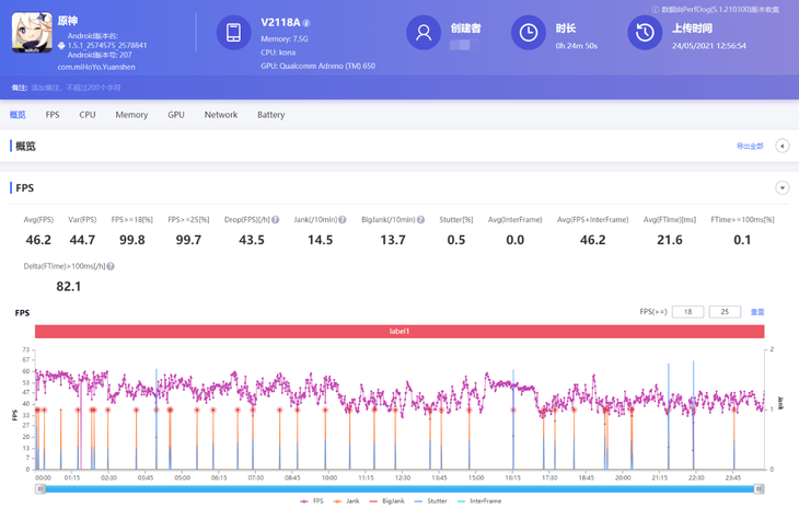 在《原神》游戏测试中,画质设置同样为特效全开,测试场景为璃月港。软件记录到的平均帧数为46.2帧,虽然帧率波动比较大,但游戏全程还是能够保证不错的流畅度。如果你想要更好的流畅度,适当降低一下画质,流畅度会有明显体验提升。