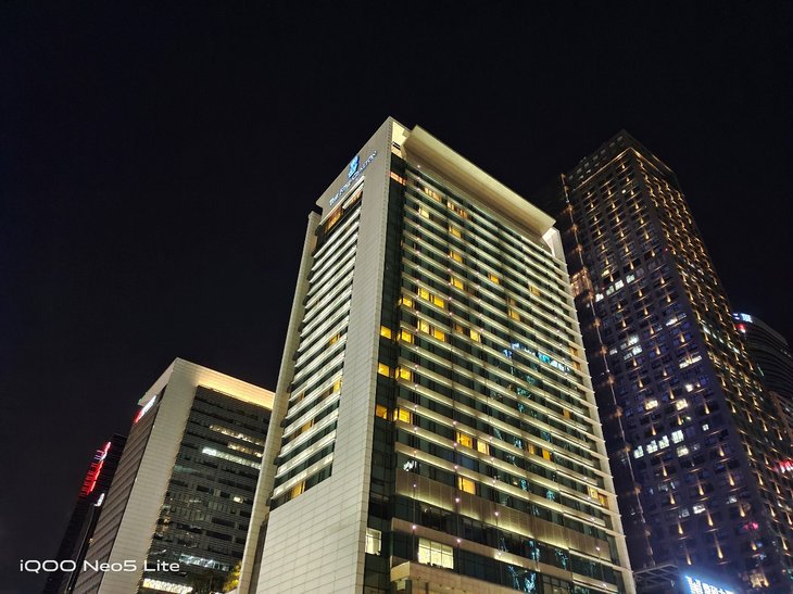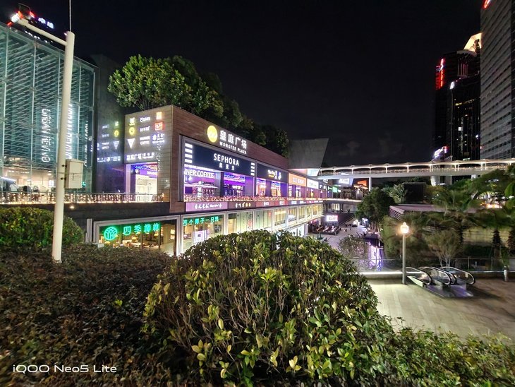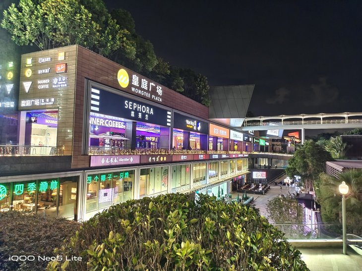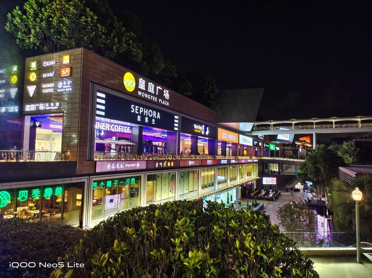 在夜拍场景,默认模式下拍摄到的夜景照片清晰自然,夜景模式下会对整体画面进一步提亮,丰富暗部细节。值得一提的是,iQOO Neo5 活力版的超广角镜头也支持夜景模式,有助于提升超广角夜间成像质量。夜景模式下,相机还提供黑金、蓝冰、赛博朋克等不同照片风格可选。