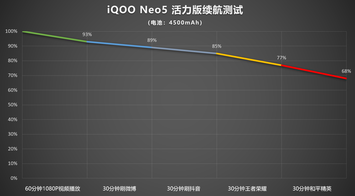 续航方面,包括在线看视频,刷微博、抖音,玩游戏环节,屏幕刷新率设置为144Hz模式、亮度50%。经过连续3个小时续航测试,iQOO Neo5 活力版剩余电量仍旧还有68%,这样的表现很不错,相信轻度用户应对工作日一天使用压力不大。