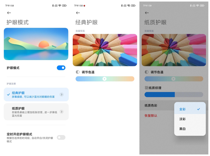 Redmi Note 10 Pro支持阳光屏,在户外阳光下,也能拥有清晰透亮的显示效果。并支持纸质护眼,在暖色基础上增加纸张纹理,提供全彩、淡彩、黑白三种色彩可选,进一步降低蓝光伤害。同时支持最低 1nit 夜光屏,夜晚暗光环境下观看更舒适、不刺眼。