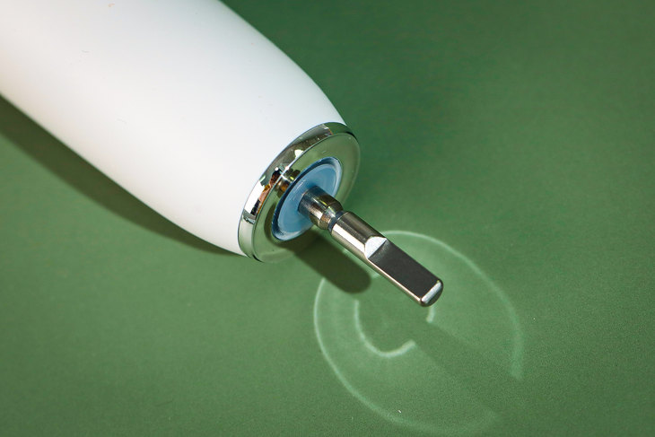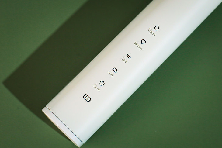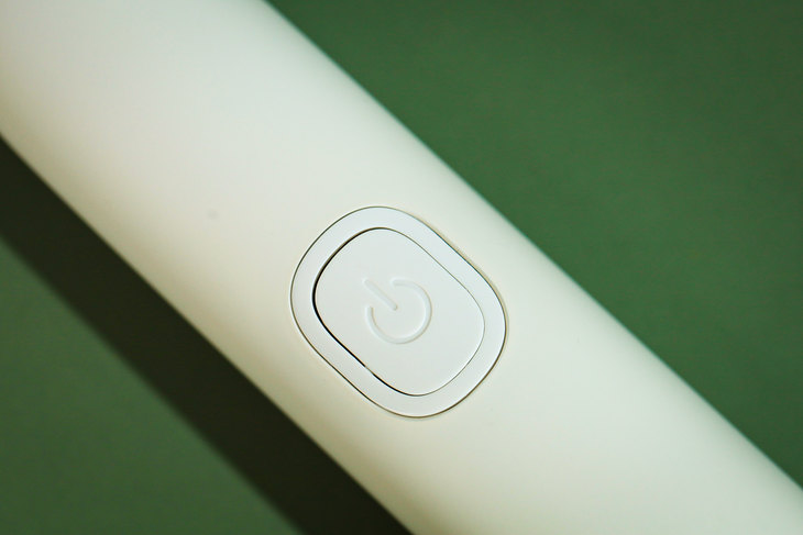 雷神声波电动牙刷手柄正面, 有一个椭圆的按键为无缝开关按键设计,可有效防止水浸和牙膏粘堵,同时也兼具不同功能和档位切换的作用,在使用的过程中可以更具需求来切换模式。雷神声波电动牙刷有五种刷牙模式,分别为清洁模式、美白模式、敏感模式、按摩模式和护龈模式,可根据个人需求灵活进行选择,同时下方的相应指示灯也会亮起。而在模式图标下面怎么电源指示灯,在使用时以及充电的时候都能即时了解到牙刷的电量情况。值得一提的是,这款雷神声波电动牙刷具备自动记忆功能,这以往只在一些高端电动牙刷产品上才具备,使用后牙刷将记忆当前选定的模式,下次开机时自动选定被记忆的模式,无需多次调节,使用起来更加便捷。