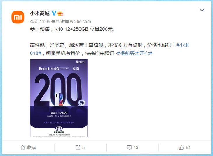 小米最新公布了Redmi K40 12+256GB手机618大促的活动信息,现在参与预购的消费者可立省200块钱,618开门红到手价仅2499。