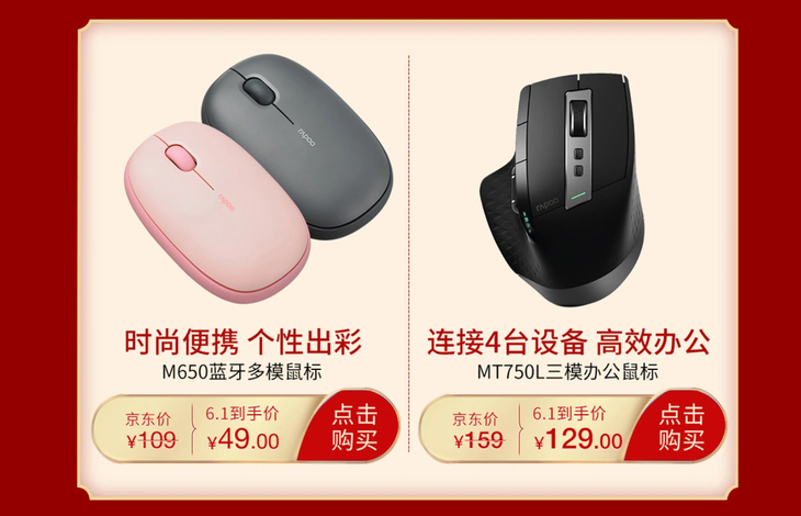在这次活动中,雷柏M650蓝牙多模鼠标产品优惠幅度极大。雷柏M650蓝牙多模鼠标原价109元,活动到手价只需49元,降价幅度已经超过5折。雷柏M650蓝牙多模鼠标采用左右对称人体工学设计,圆润小巧,支持三种连接方式,支持1300 DPI,拥有超高性价比的同时,也能带来不错的使用体验。