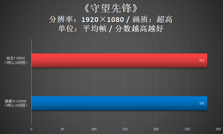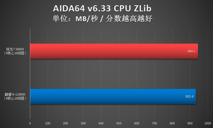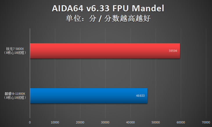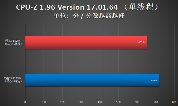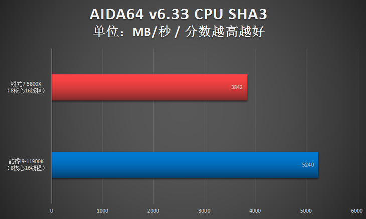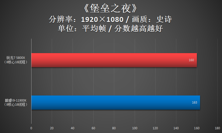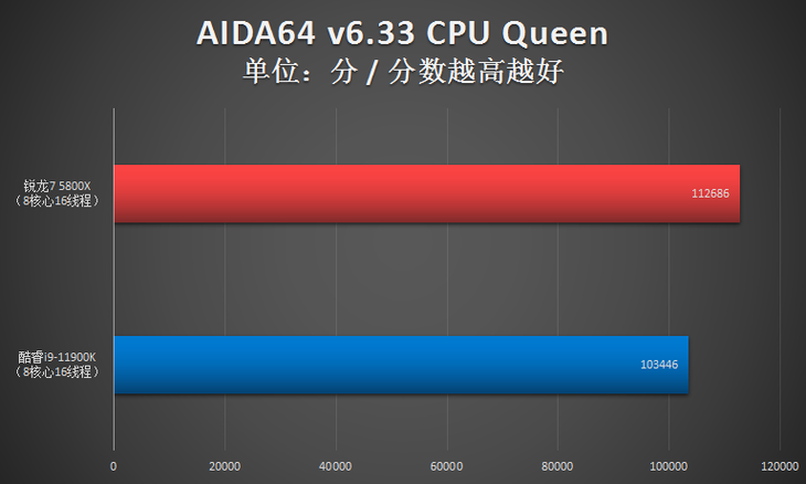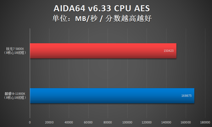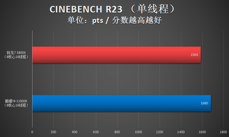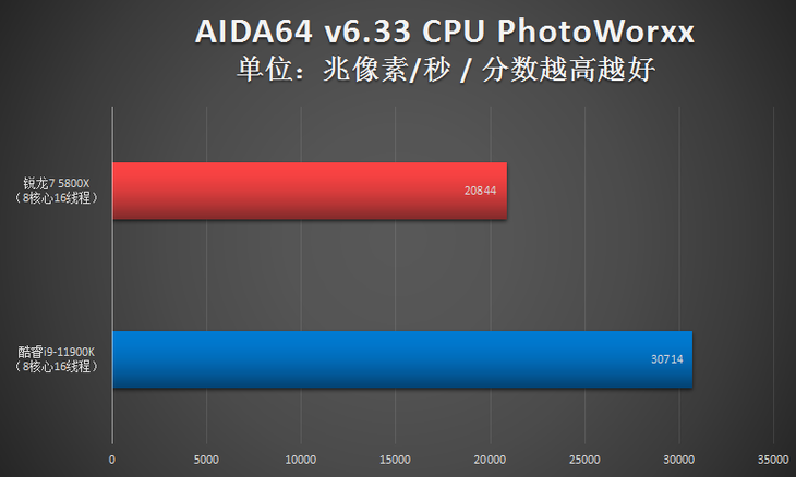 该项测试,虽然酷睿i9-11900K单核性能占优,但是锐龙7 5800X多核效率更高。两者大体持平。