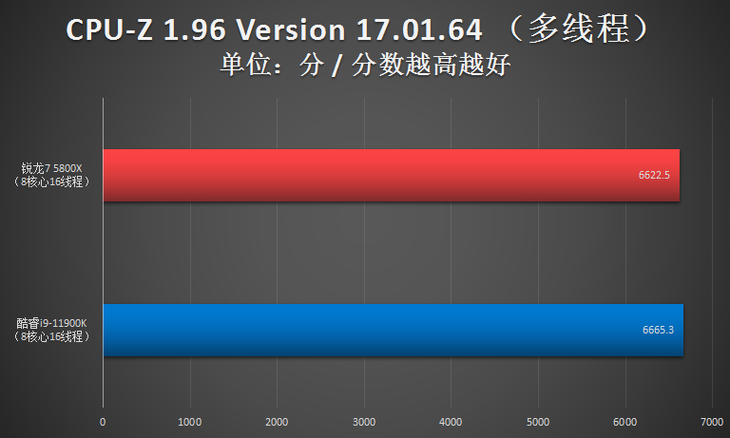 该项测试,酷睿i9-11900K依旧单核性能占优,但是锐龙7 5800X多核效率更高,因此在多核性能方面几乎追上了酷睿i9-11900K。