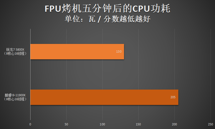很明显,同样为8核心16线程规格,锐龙7 5800X可比酷睿i9-11900K省电多了。
