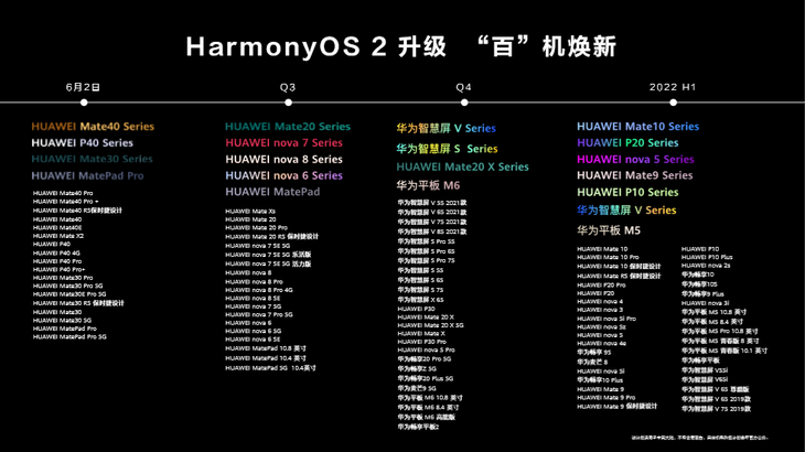 具体升级计划上,今年第三季度华为Mate Xs、Mate20系列、 Nova6、7、8系列、华为MatePad将可以升级HarmonyOS。等到第四季度,华为智慧屏V系列2021款、华为智慧屏S系列、华为智慧屏X65、Mate20 X系列、P30系列、Mate X、华为畅享20系列、华为麦芒9、华为平板M6、华为畅享平板2等也将实现系统升级。