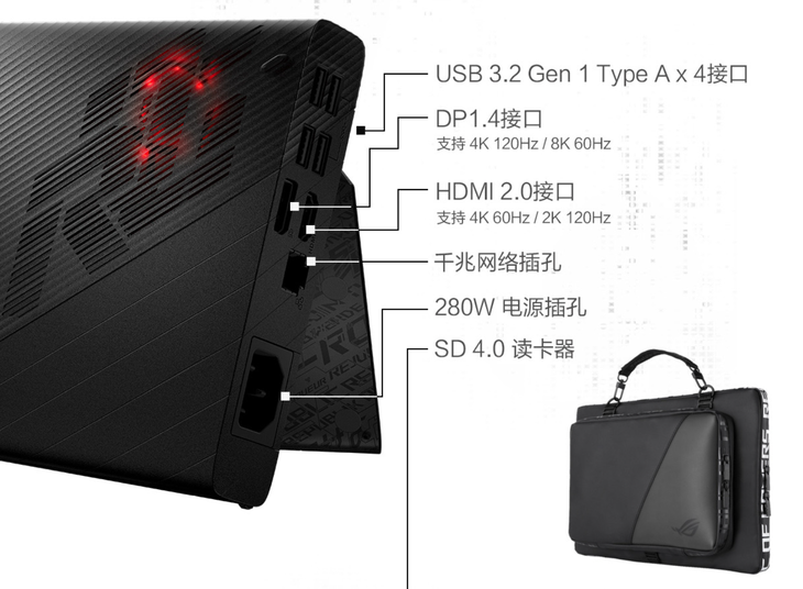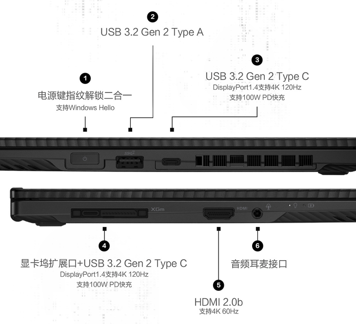 华硕ROG 幻13内置丰富接口,拥有一个USB-A、一个USB-C(支持DP1.4)、一个显卡拓展口+USB-C(支持DP1.4)、HDMI 3.0b以及音频耳麦接口。