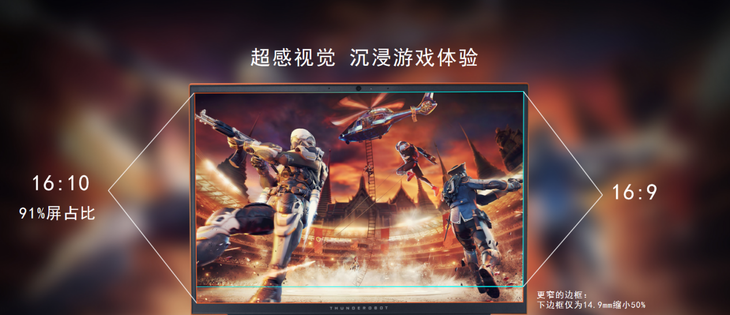 第二方面就是,雷神ZERO游戏本采用了当今非常流行的窄边框设计,实现了高达91%的屏占比,视觉效果进一步提升,令屏幕看上去更宽广了。