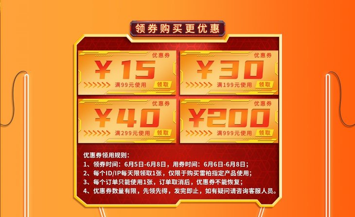 在活动页面,你可以先领取满减优惠券,包括满99减15元,满199减30元、满299减40元以及满999减200元,指定产品可享受满减,领券购买更加划算。