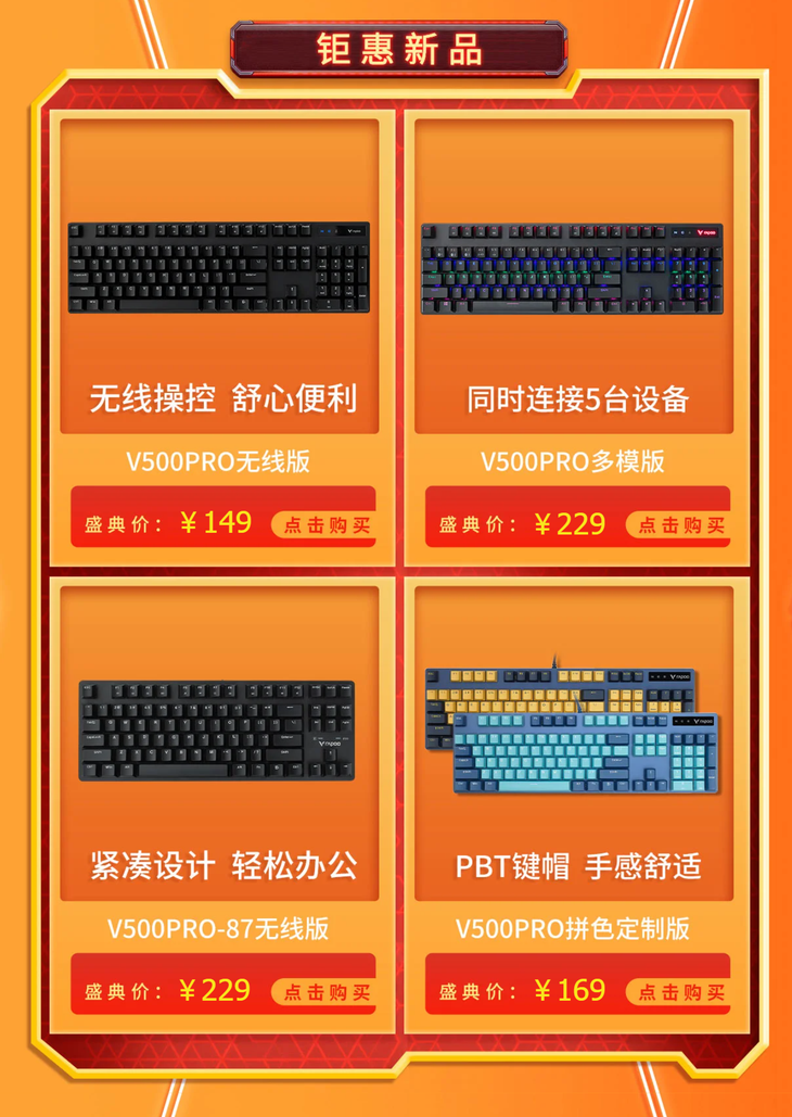 雷柏V500PRO系列机械键盘也参与此次活动,包括多种不同版本,最低价只需99元。雷柏V500PRO系列机械键盘搭载混彩背光系统,采用磨砂金属上盖、双色注塑键帽、雷柏自主机械轴等。雷柏V500PRO系列拥有实惠价格的同时,也能保证不错的使用体验。