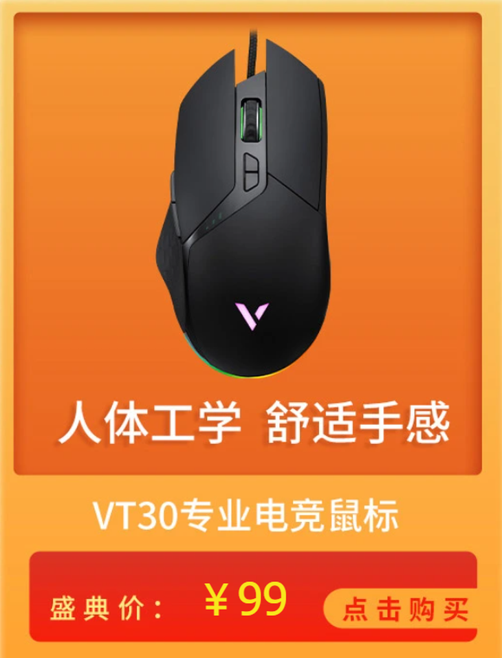 雷柏VT30幻彩RGB游戏鼠标原价149元,活动价只需99元,这款鼠标还能使用满99元减15元的优惠券,相当于到手价只需84元。这款鼠标配备1680万色三区域RGB灯光系统,搭载P3327传感器,给你畅快的游戏体验。