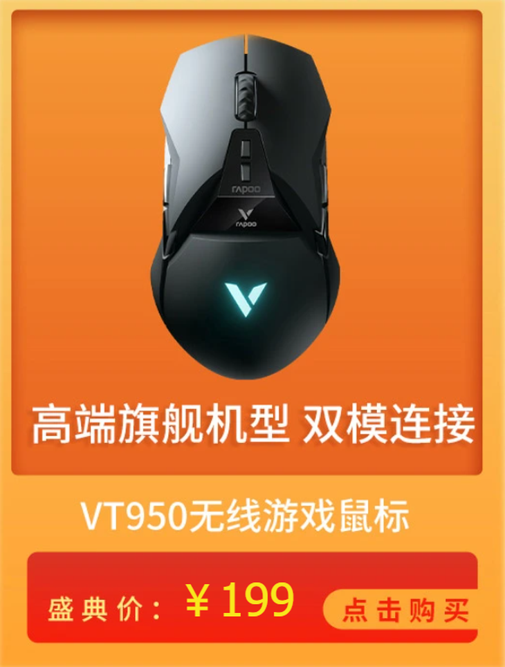 雷柏VT950电竞游戏鼠标,原价299元,活动到手价199元。雷柏VT950采用左右手通用对称式设计,支持无线/有线双连接模式,采用PMW3389传感器、内置OLED显示屏,支持可拆卸配重块等,更容易满足电竞玩家的各种需求。