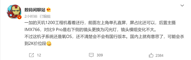 @数码闲聊站还提到,目前这款搭载天玑1200的一加工程机搭载氧OS系统,尚不清楚是否会有国行版,如果有,可能定价会在2K价位段。