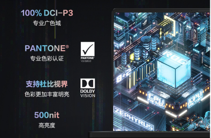 在显示方面,幻16采用了16:10的黄金比例长宽比无论是日常使用还是游戏娱乐,都能够获得大视野的视觉享受,同时2K分辨率带来更精细的显示效果。幻16的屏幕覆盖100% DCI-P3色域并通过Pantone色彩认证,还支持Dolby Vision。高达500nit的屏幕亮度,带来更清晰明亮的显示效果。