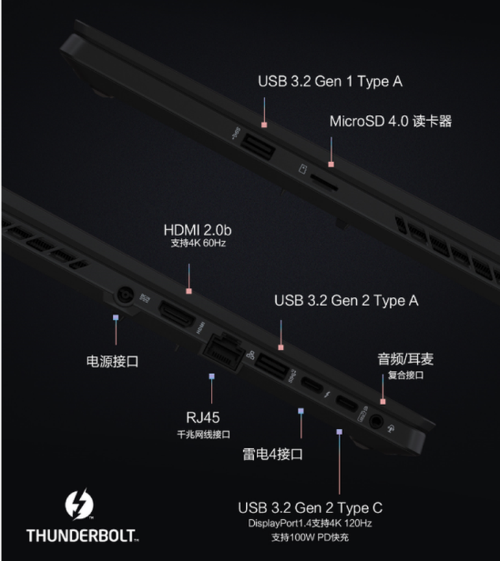 为了满足用户的扩展需求,幻16拥有非常丰富的接口配置,其中雷电4接口具有高达40Gbps的带宽速率,能够方便用户外接设备进行高速数据传输。再加上HDMI2.0和全功能Type-C接口,幻16可最多外接4个屏幕,无论是游戏还是日常创作,都能带来无与伦比的体验。