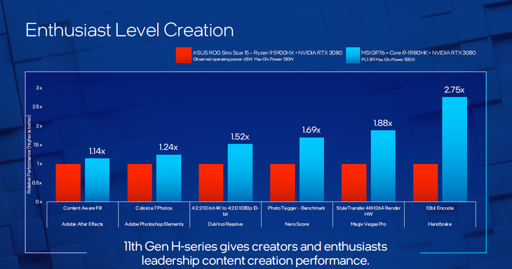 根据英特尔官方的测试,在内容创作方面,英特尔H45移动处理器相比AMD普遍有着非常明显的性能优势。其中在HandBrake 10 bit编码工作负载测试项目中,相比于AMD,英特尔的优势更是高达2.75倍之多。