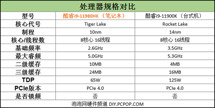 根据上面的规格对比列表来看,即使跟自家11代台式机处理器对比的话,第11代智能英特尔酷睿高性能移动版处理器H45在硬件规格方面也是要更强的。强的地方主要体现在二级缓存、三级缓存这两项较为关键的指标上。当然,受限于笔记本平台的限制,英特尔H45移动处理器的功耗是要比11代台式机处理器低的。