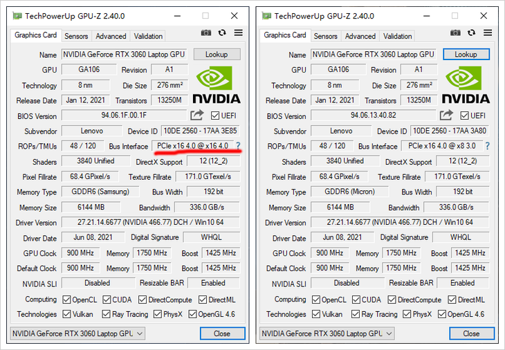 特别是,通过GPU-Z来看,这两款游戏本所搭配的RTX3060笔记本电脑GPU的频率也是一模一样的。只不过,联想拯救者Y9000P 2021款的显卡是在PCIe4.0 x16模式下运行,联想拯救者R9000P 2021款的显卡是在PCIe3.0 x8模式下运行。显卡的这个差异主要是由英特尔和AMD平台的差异性决定的。英特尔H45移动处理器内建有20条PCIe4.0通道,能够充分发挥新一代RTX30系列显卡的性能。反观AMD这一代ZEN3架构移动处理器就要差一些了,新一代RTX30显卡仅能在其平台上运行在PCIe3.0 x8的模式下。