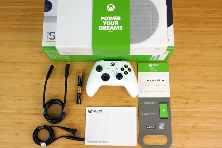 国行版Xbox Series S包装中包含主机、手柄、两节5号电池、快速上手指南、保修卡、HDMI数据线以及电源线。