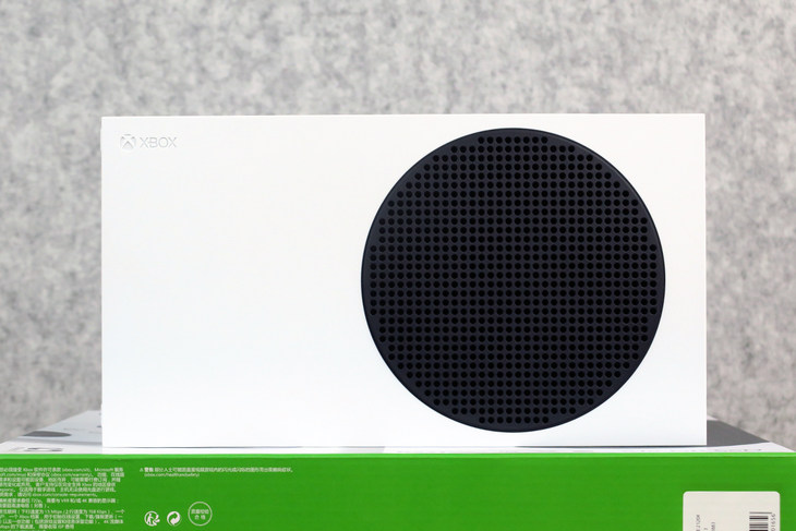 在外包装上我们可以看到Xbox Series S的机身以及手柄,在包装的有右下角印有Xbox Series S的配置与功能等信息。Xbox Series S容量为512GB,支持120FPS显示。