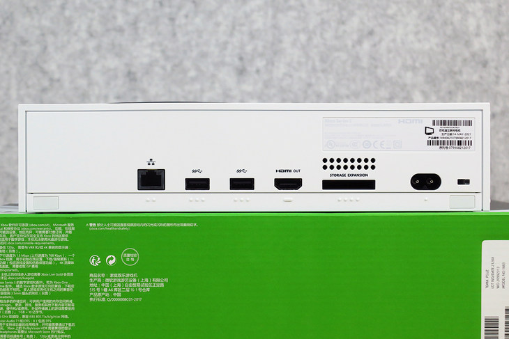 在机身背面则是接口,Xbox Series S拥有网线接口、USB数据线接口×2、HDMI接口、硬盘扩展接口以及电源口,Xbox Series S也支持HDMI 2.1输出,可以实现最高2K、120FPS的游戏体验。