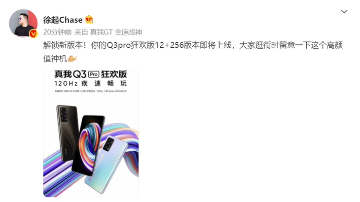 6月27日,realme副总裁、中国区总裁、全球营销总裁徐起Chase在微博上透露,真我Q3 Pro狂欢版12GB+256GB版本即将上线,但尚未公布价格。