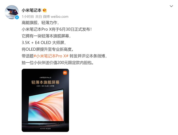 小米笔记本Pro X采用3.5K + E4 OLED 大师屏,将会在6月30日正式发布。