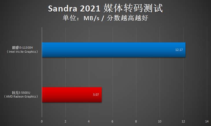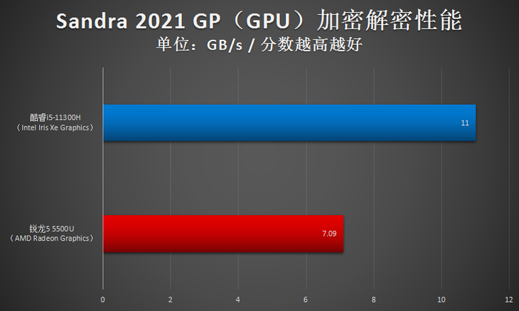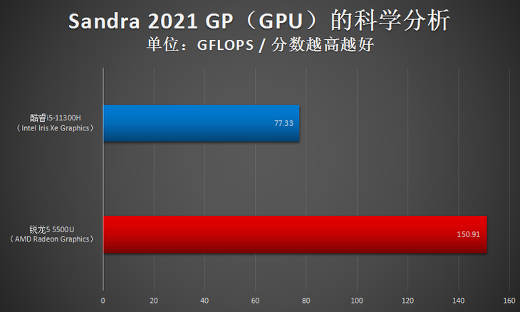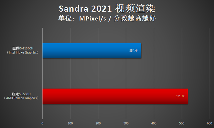 测试小结:此项测试,酷睿i5-11300H的核显性能在多数项目中占优。反观AMD Radeon Graphics,该显卡毕竟是老架构了,在面对英特尔新核显的时候,性能确实有些落下风了。