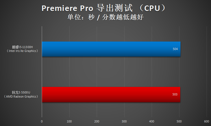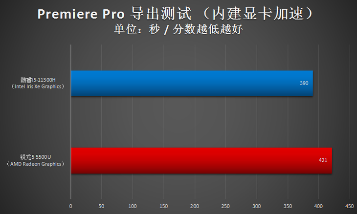 人们在进行Premiere的导出操作时,基本上都会开启内建显卡加速的,因此在此项测试中,英特尔酷睿i5-11300H无疑是更出色的一方。