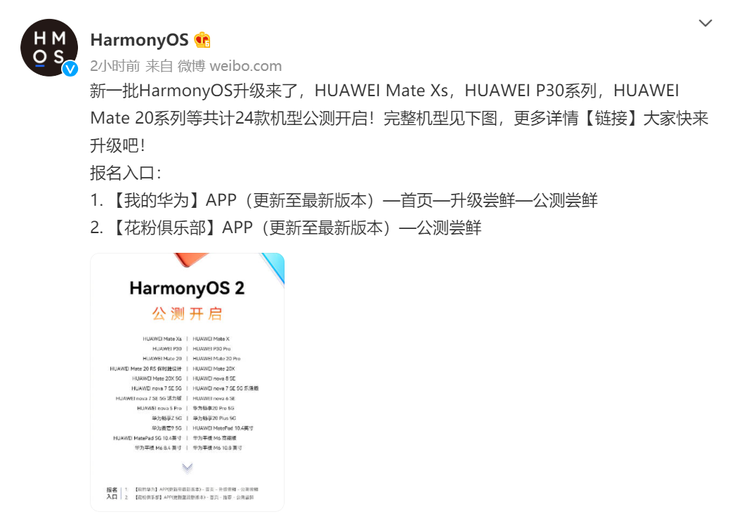 此次公测机型包括HUAWEI Mate Xs,HUAWEI P30系列,HUAWEI Mate 20系列等共计24款机型。
