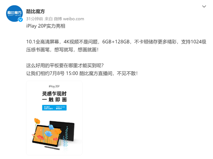7月6日,酷比魔方官方宣布,酷比魔方iPlay 20P平板电脑将在7月8日15点发布。