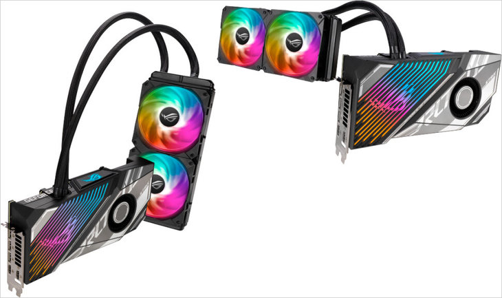 这两款显卡均搭配有240mm水冷排,上面均配备两枚120mm散热风扇。其他方面,供电接口均为3个8pin设计,视频输出接口均为3个DisplayPort 1.4a以及两个HDMI 2.1。还有,导风罩以及散热风扇上面均设计了RGB灯效,尽显高端风采。